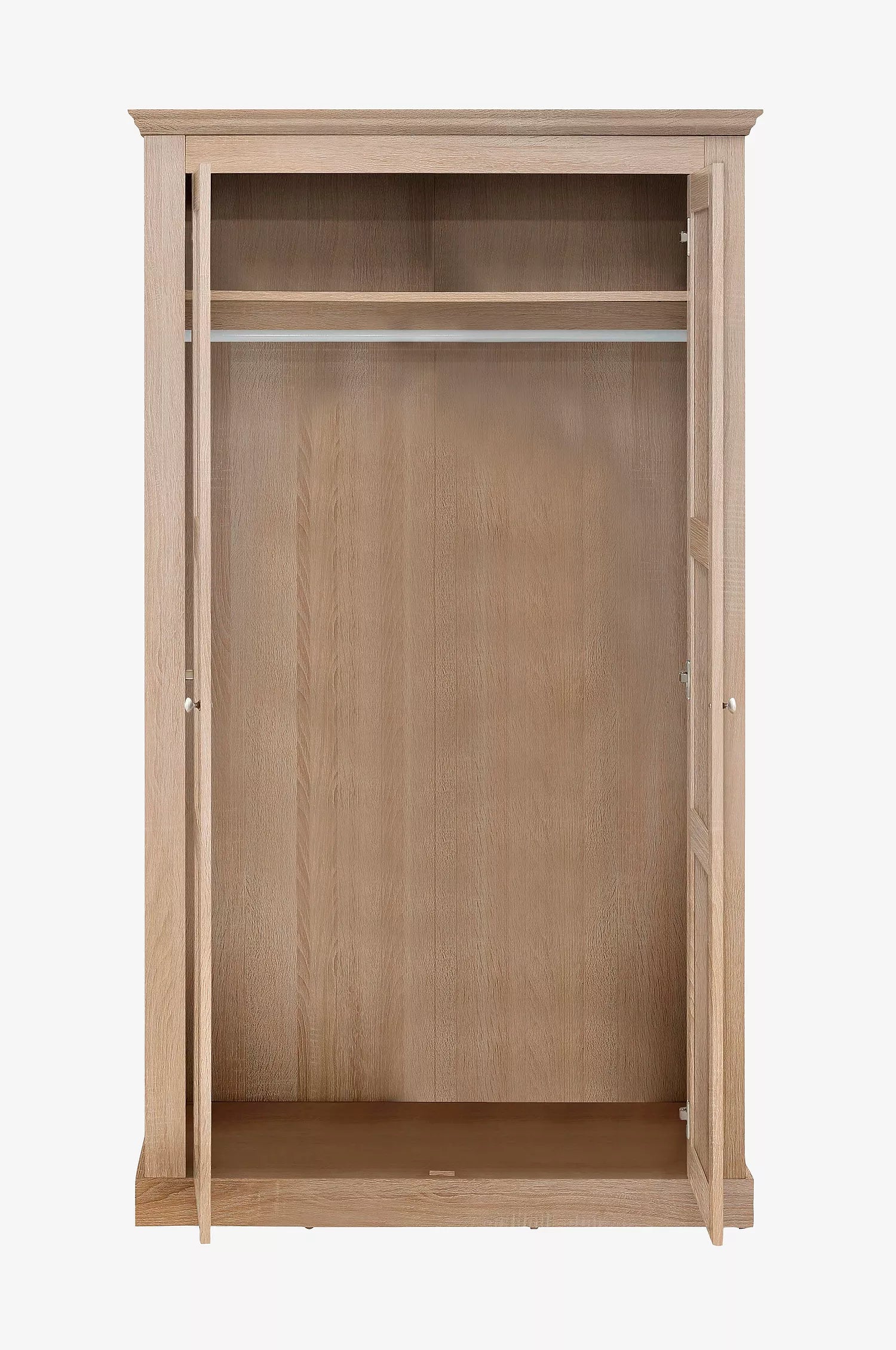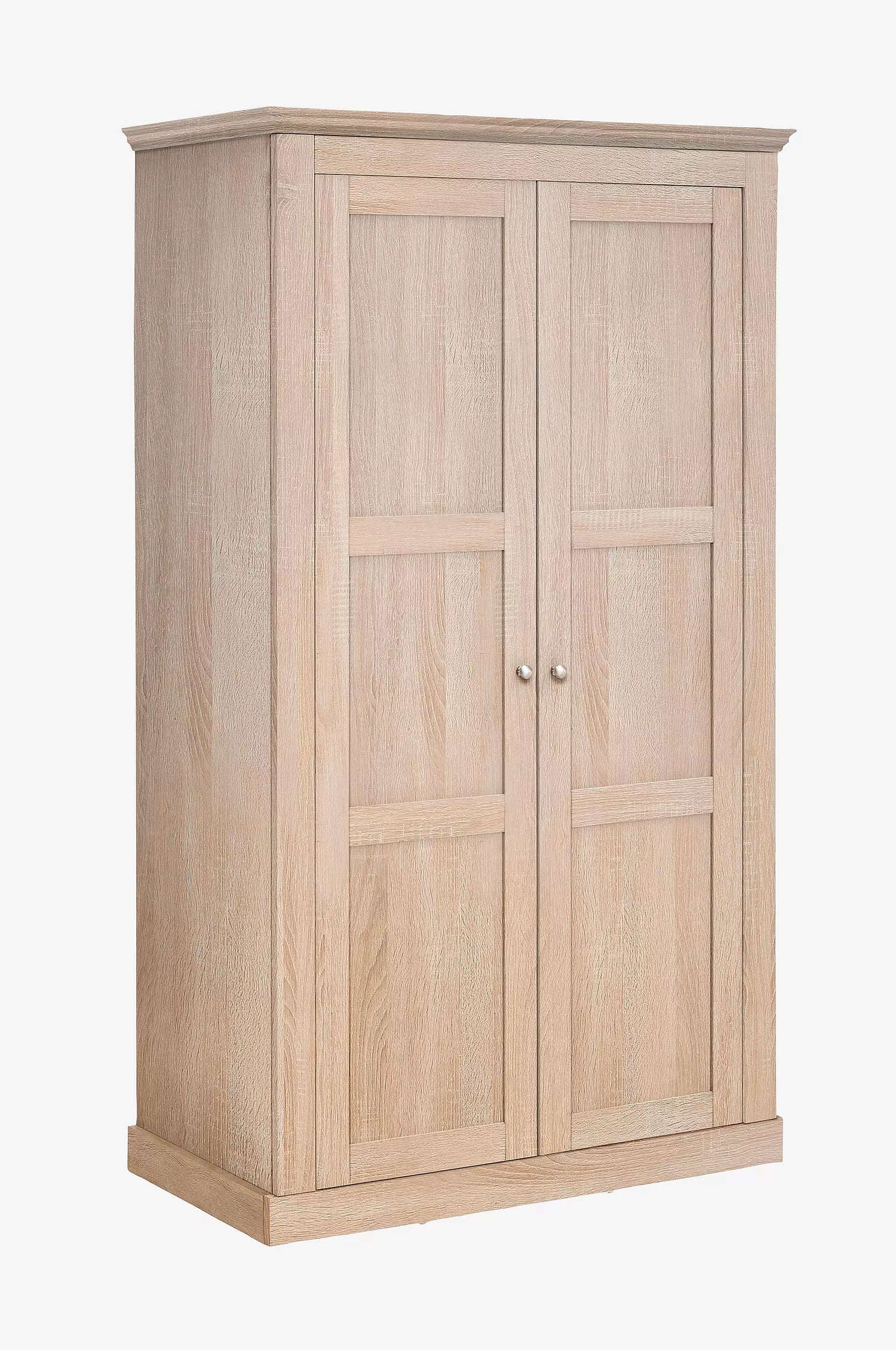 En rymlig garderob i lantlig design som passar i många olika hem. De två dörrarna med dekorativa knapphandtag och detaljer i trälook ger en varm och inbjudande känsla. Invändigt finns både hyllfack och klädstång för praktisk och organiserad förvaring.