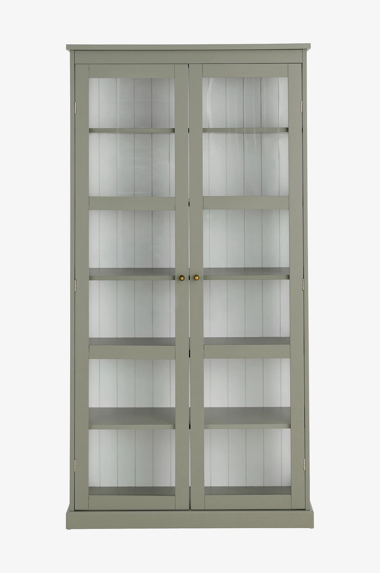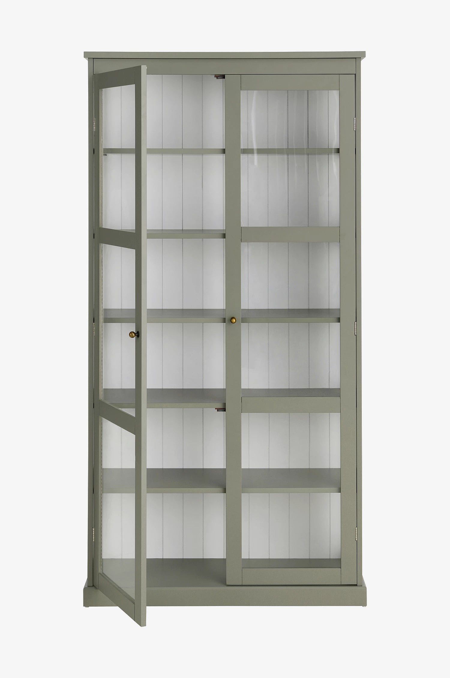 Vackert vitrinskåp i lackad MDF med transparent glas även på kortsidorna – perfekt för att släppa in ljuset och framhäva dina favoritsaker. Skåpet har dörrar med magnetstängning och metallknoppar i antikmässingfinish som ger ett klassiskt uttryck. Utrustat med 5 flyttbara hyllplan samt en bottenhylla för flexibel förvaring.