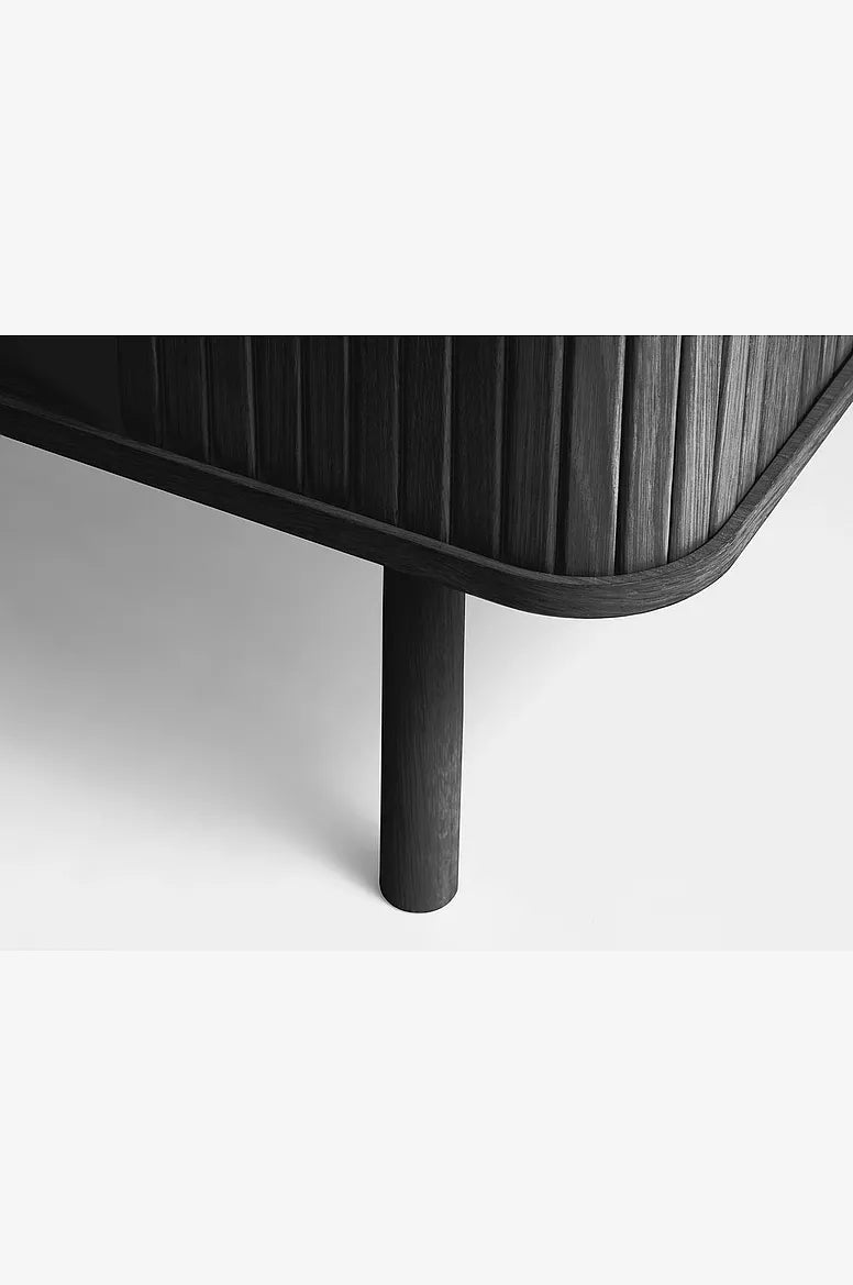 TV-bänken är tillverkad i ekfanér och erbjuder både stil och praktisk förvaring för TV-utrustning. Den invändiga hyllan är justerbar vilket gör det enkelt att anpassa utrymmet efter olika apparater som spelkonsoler, digitalboxar eller mediaspelare.