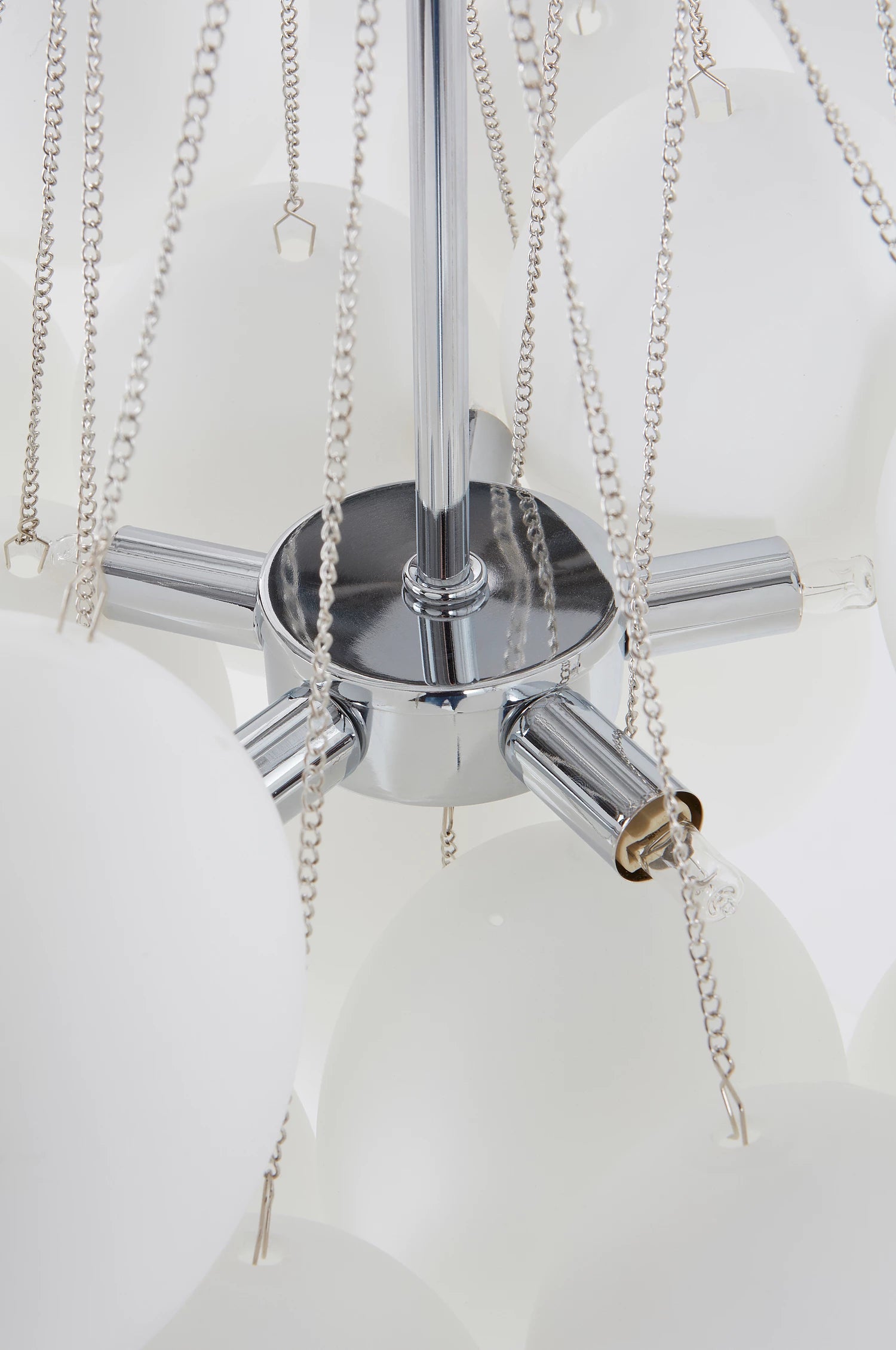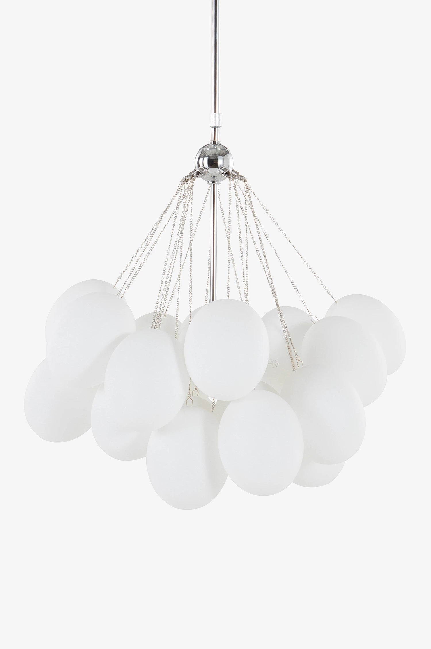 Denna imponerande taklampa med 21 runda klot i opalglas är designad för att bli rummets självklara blickfång. De mjuka, frostade glaskuporna är arrangerade i en elegant klunga som skapar både djup och rörelse, samtidigt som lampan ger ett behagligt och jämnt ljus. Fem av kuporna är utrustade med ljushållare, vilket gör att ljuset sprids på ett mjukt och stämningsfullt sätt – perfekt för sociala ytor som matsal eller vardagsrum.