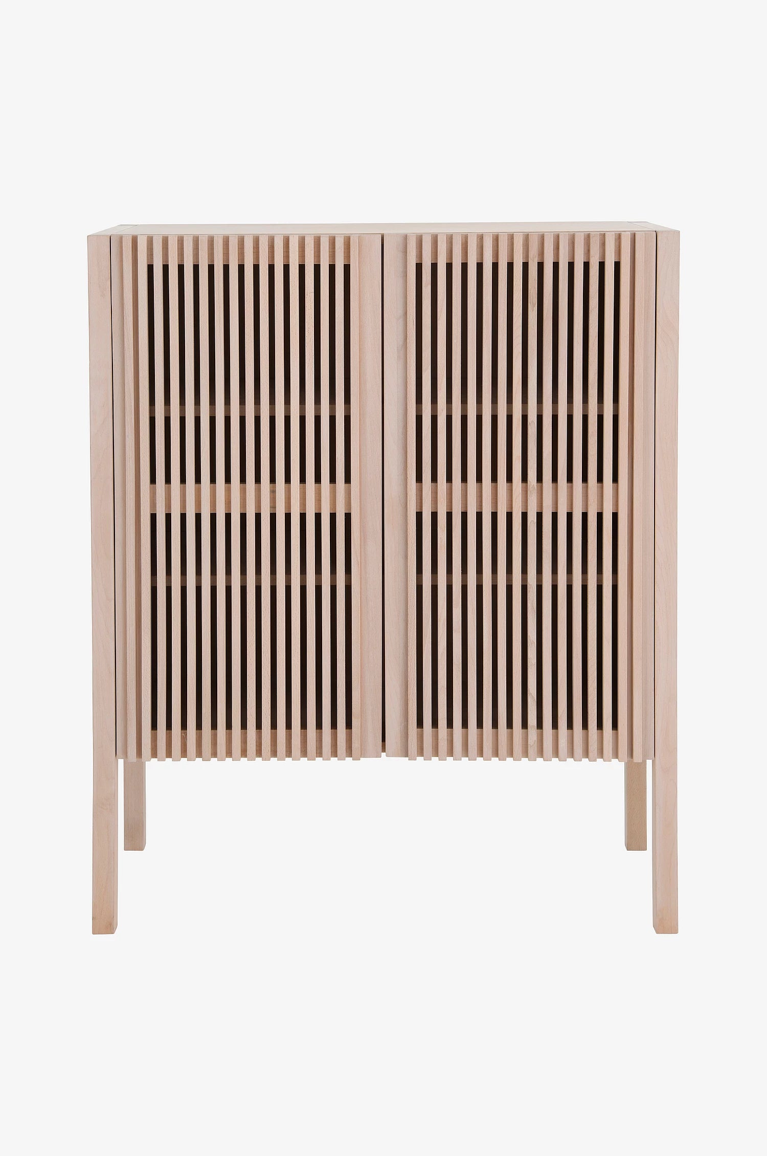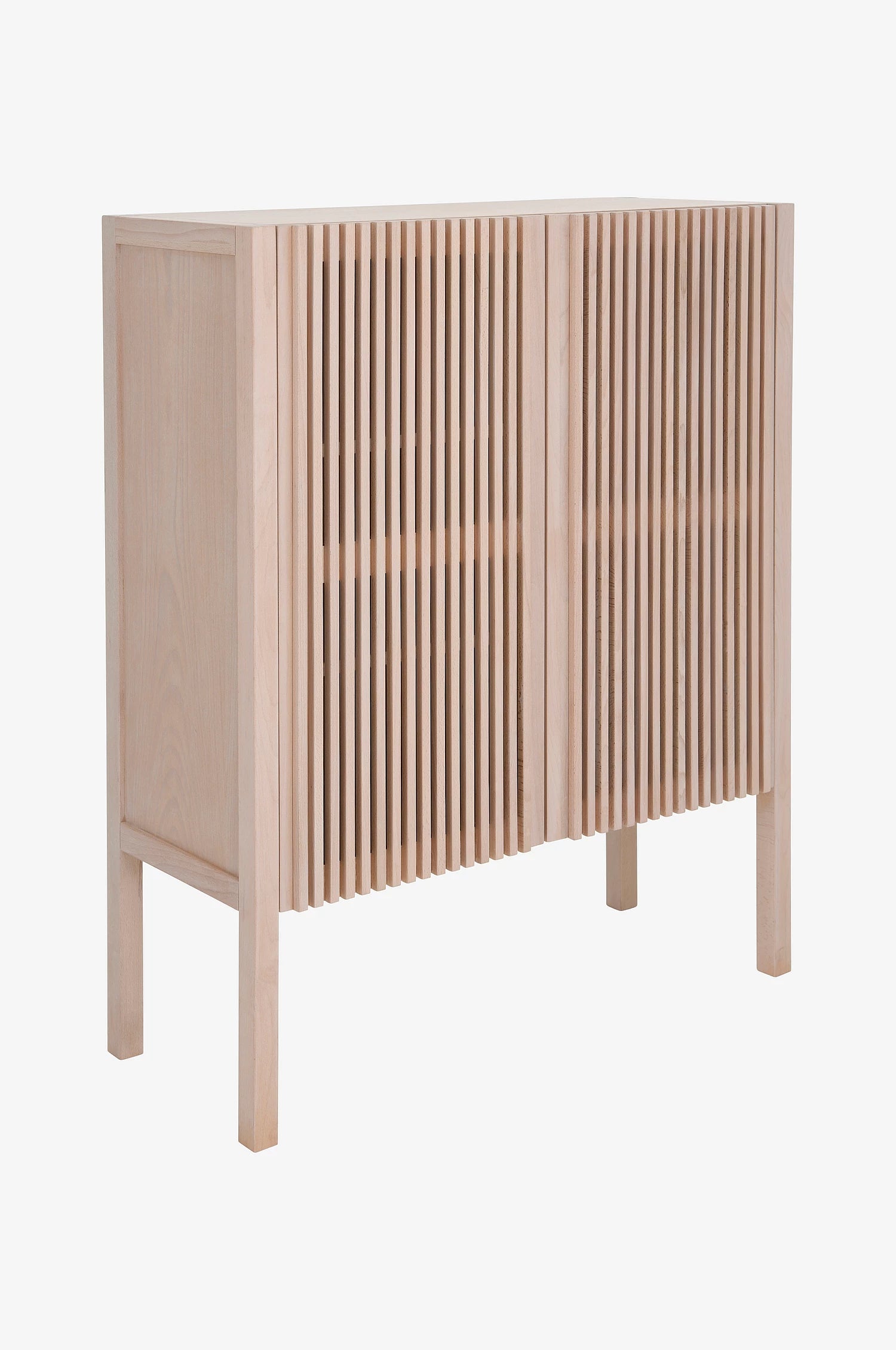 Detta skåp i bok kombinerar naturlig värme med modern formgivning. De ribbade luckorna ger möbeln ett levande och elegant uttryck, medan den luftiga designen med frihöjd undertill skapar ett lätt intryck i rummet. Skåpet har två fasta hyllplan som erbjuder praktisk förvaring för allt från porslin till böcker och inredningsdetaljer.