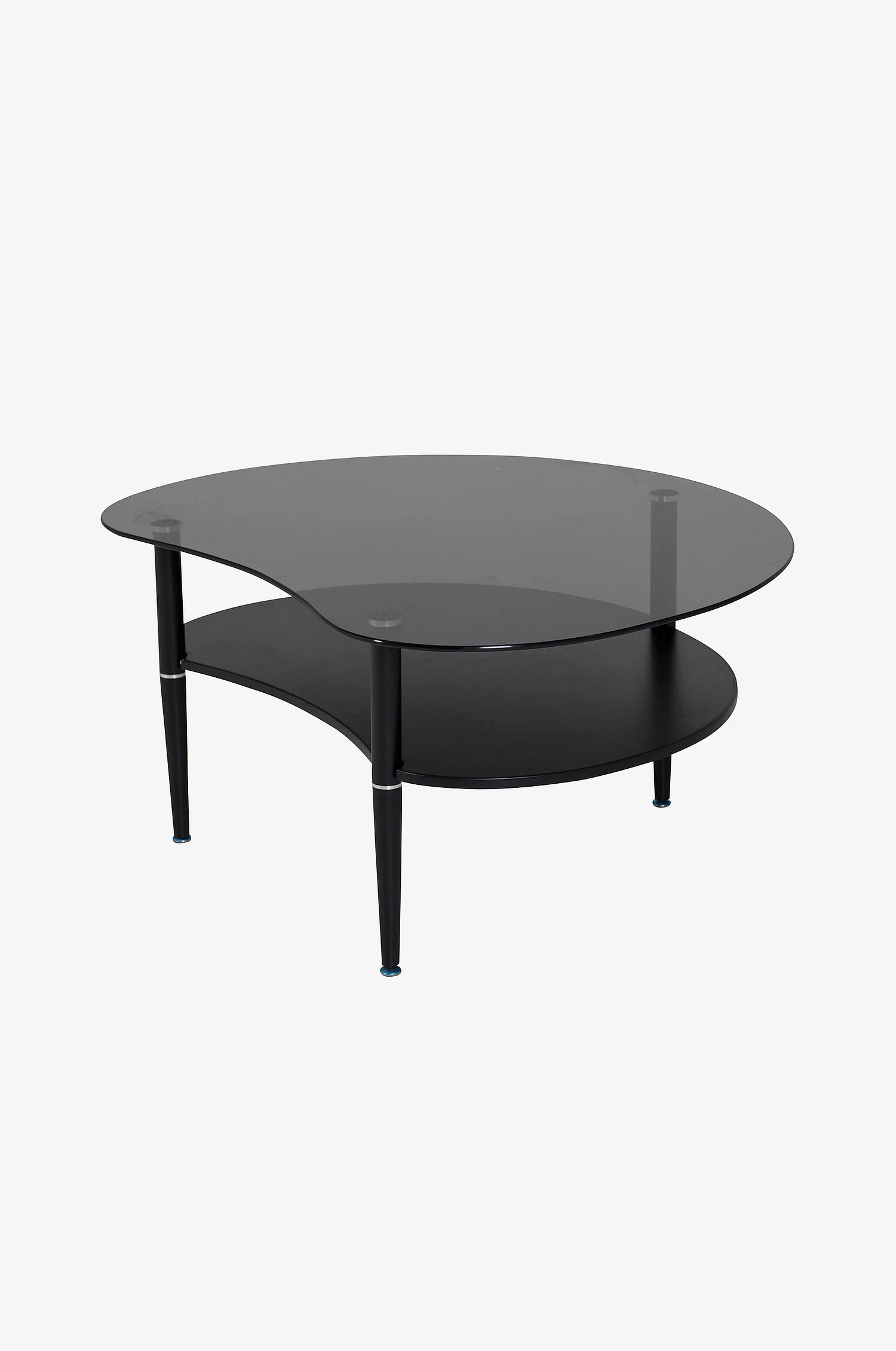 Ett elegant soffbord med rund form och dubbla plan – översta i härdat rökfärgat glas, undre i svart MDF. Svarta järnben ger en modern touch och stabil konstruktion.