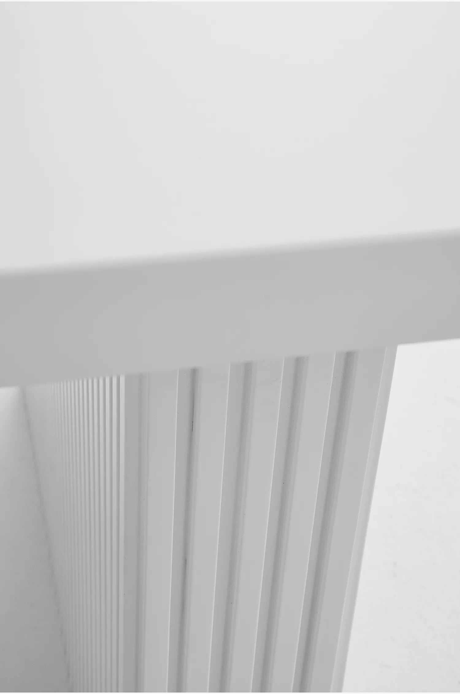 Benen är robusta och dekorerade med urfrästa vertikala ränder, vilket skapar ett subtilt retrointryck. Den kantiga bordsskivan kombineras med mjukt rundade hörn på benen för en balanserad och elegant look. Skruvar medföljer, och viss montering krävs.