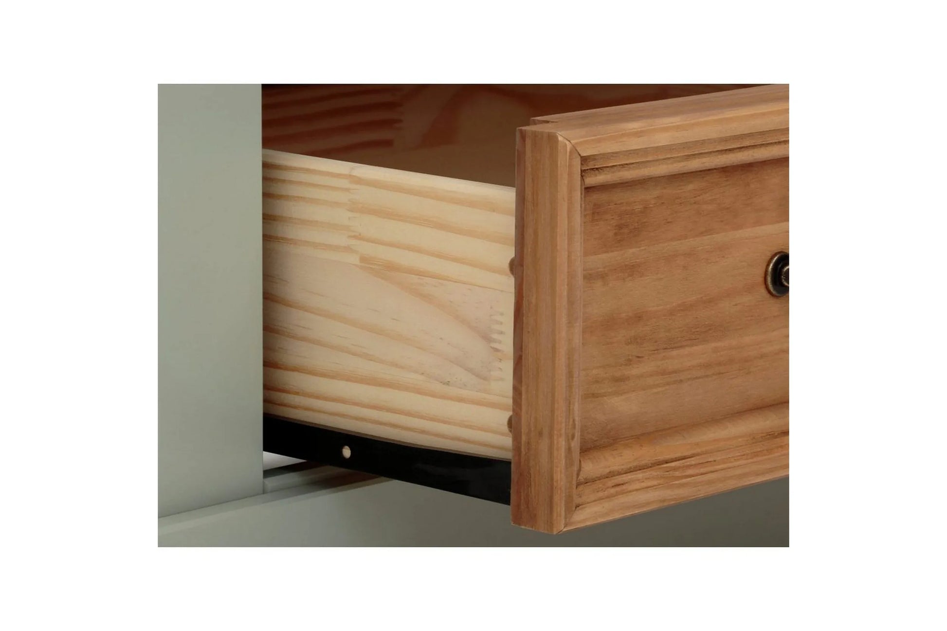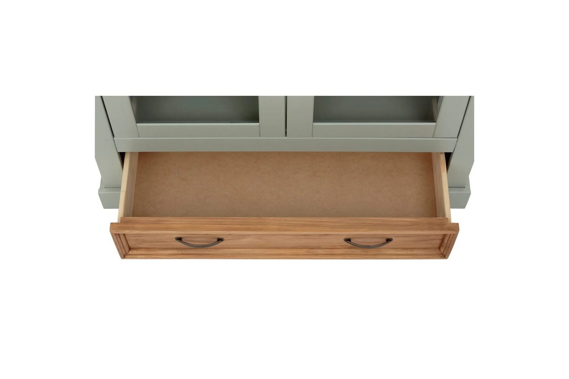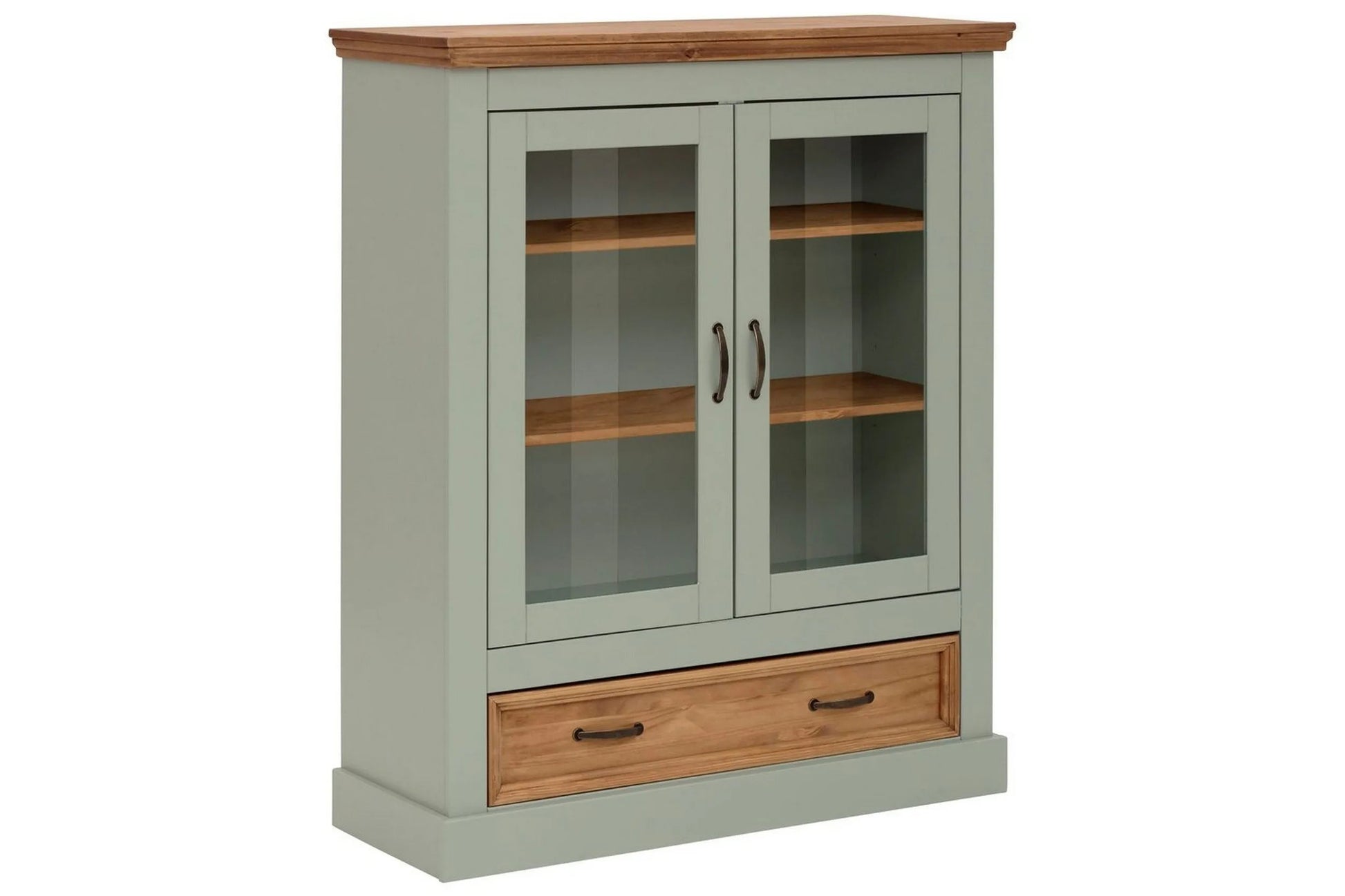 Detta vitrinskåp i massiv, FSC-certifierad furu kombinerar hållbar kvalitet med tidlös design. De två glasdörrarna ger en fin överblick över innehållet, medan den praktiska lådan erbjuder extra förvaringsutrymme. Den salviagröna finishen tillsammans med metallhandtag i antik mässing skapar ett elegant och sofistikerat uttryck. Träets naturliga ådring och knutar syns genom ytan och gör varje skåp unikt.