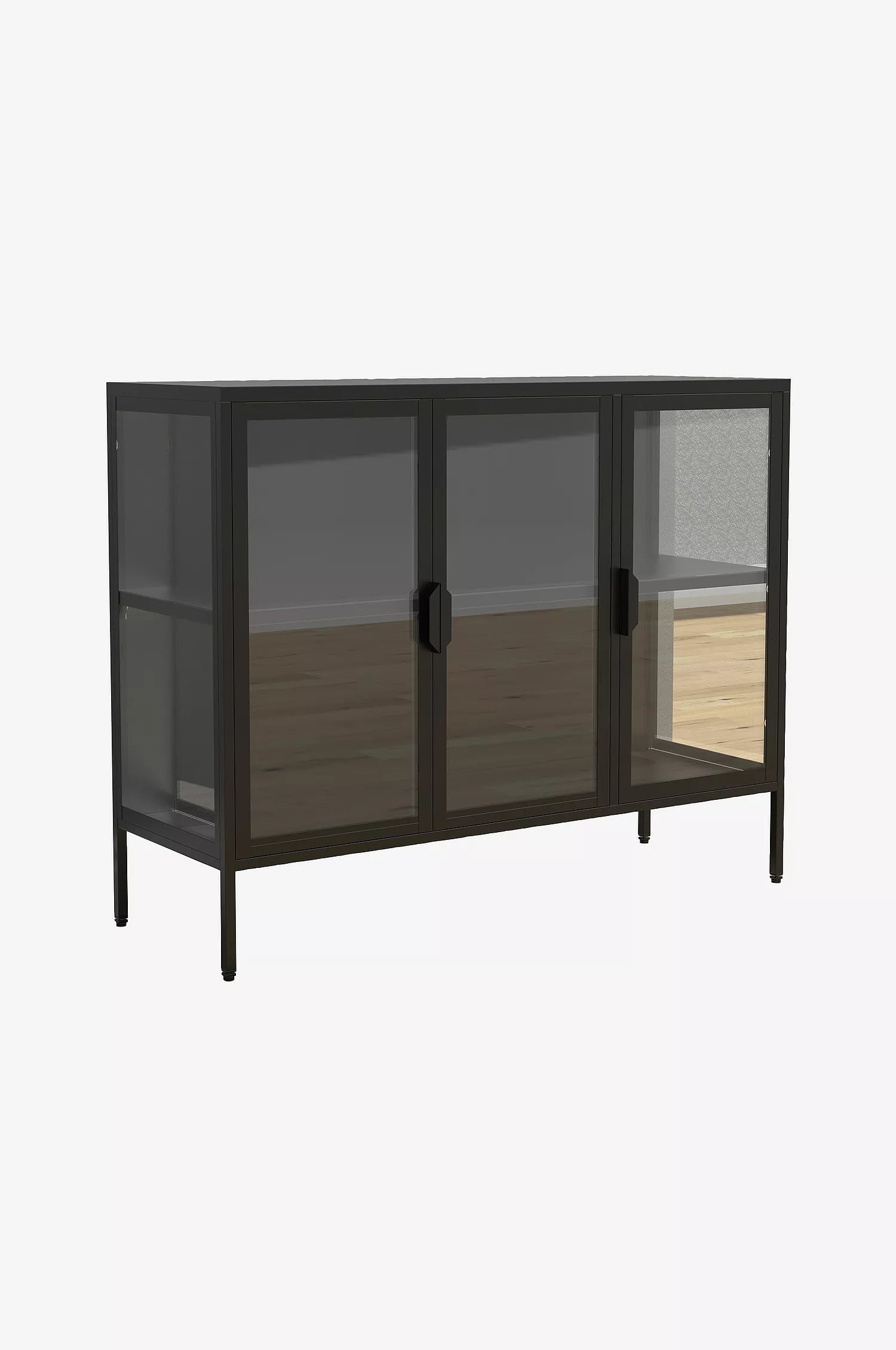 Vitrinskåpet i elegant kombination av modern design och praktisk funktion. Med en ram i hållbart stål och dörrar samt sidopaneler i äkta glas blir skåpet en stilfull plats att visa upp dina samlarobjekt eller inredningsdetaljer. Den medföljande hyllan skapar extra förvaringsyta, medan den stabila konstruktionen gör skåpet till en långsiktig investering.