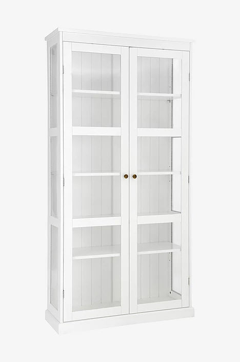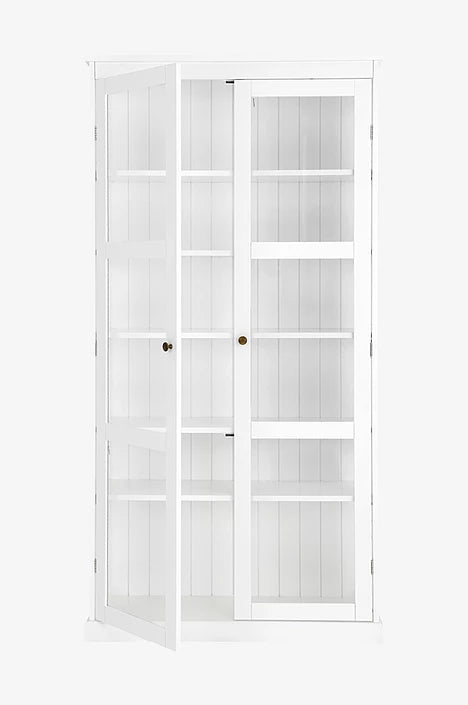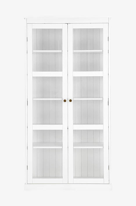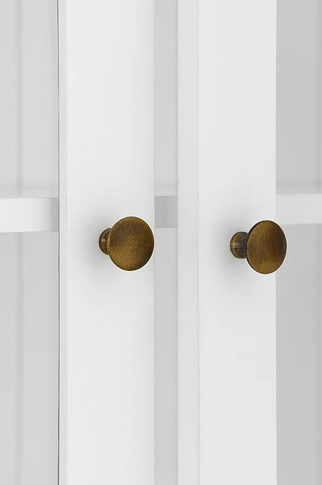De helglasade dörrarna är försedda med magnetstängning och dekorativa metallknoppar i antikmässingfinish som tillför en varm, klassisk detalj. Invändigt erbjuder LUMINA flexibel och generös förvaring med fem flyttbara hyllplan samt en stabil bottenhylla – perfekt för porslin, glas eller dekorativa föremål.